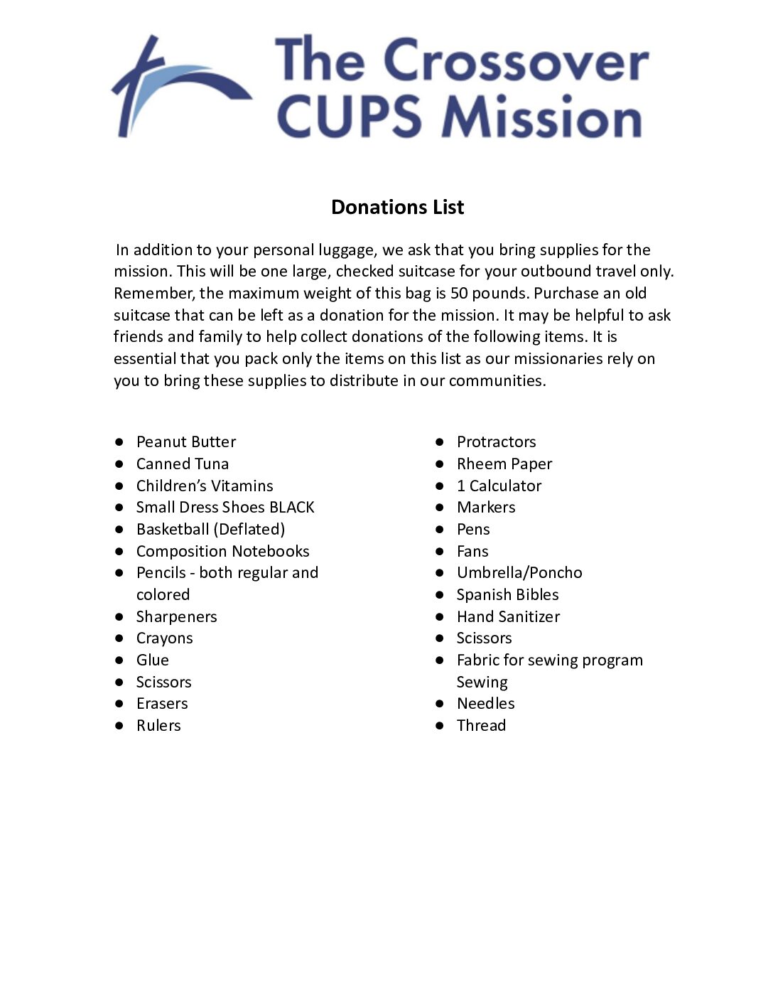 CUPS Mission, a ministry of Crossover Ministries, Inc, is a 501(c)(3) tax exempt organization with FEID Number: 57-0907653. All gifts are tax deductible to the full extent allowed by law. Contributions are solicited with the understanding that CUPS Mission has complete control over the use of all donated funds. Our Board-approved policy is that all gifts designated for a specific project be applied to that project, with minimal use for administrative and fundraising expenses. Occasionally we receive more contributions for a given project than can be wisely applied to that project. When that happens, we use these funds to meet the next most pressing need.